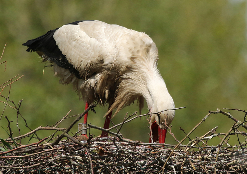 John van Erve: ‘Na ongeveer een maand broeden is er minimaal 1 jonge ooievaar in het ooievaars nest in Galecop. Het jong was redelijk goed te zien toen de moeder druk was met het schoonmaken van de kraamkamer. De blijdschap was groot toen vader terugkwam met een krop vol met heerlijk eten. Na wat kokhalzen stortte hij een hoeveelheid voorverteerd eten op het nest. De jonge ooievaar wordt niet gevoederd, maar moet zelf zijn smakelijke hapje naar binnen werken.’