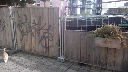 Heel vervelend dat het project er zo bij staat… Onze lokale onderhoudsploeg gaat deze week op pad om de graffiti van de houten hekken te verwijderen💪. De metalen hekken waar het zeil over gespannen is zijn echter niet bij ons gehuurd, maar we gaan in gesprek met Gemeente Nieuwegein over wat we hier aan kunnen doen, zodat de buurt er straks weer netjes uitziet🍀.