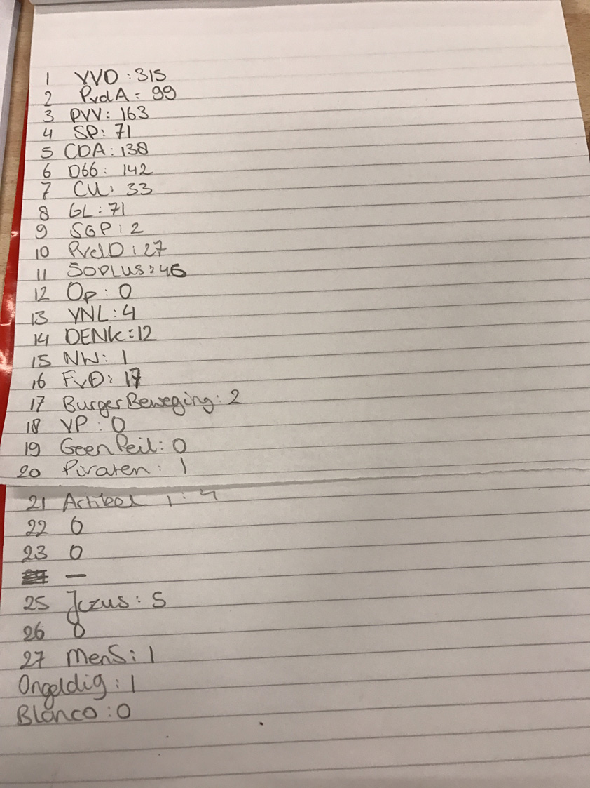 De eerste telling van stembureau Julianaschool is binne om 22.30 uur