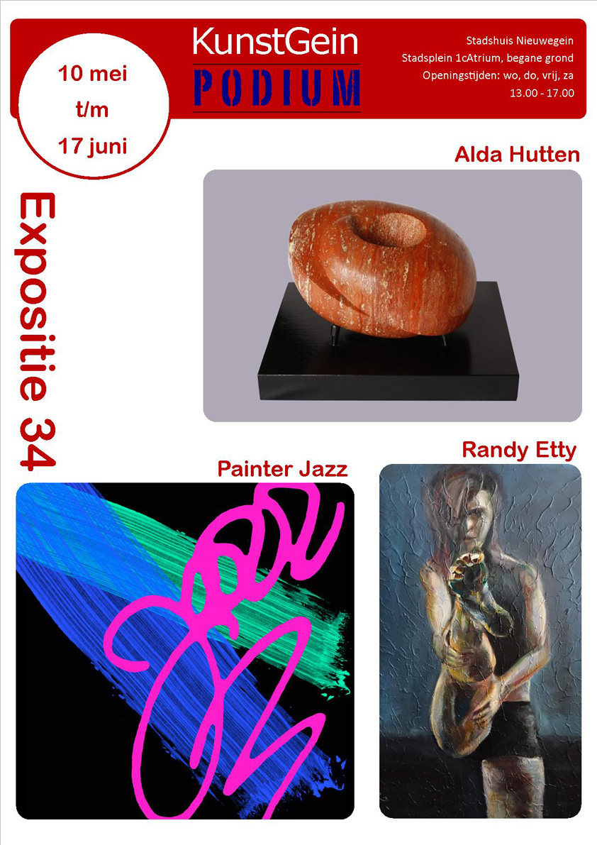 Tot zondag 18 juni exposeren er in KunstGein Podium drie kunstenaars. Alda Hutten, Randy Etty en Painter Jazz zijn de hoofdpersonen in Expo Vierendertig. Zij laten boeiend en bijzonder spectaculair werk zien in zachte maar ook felle tinten en krachtige vormen.