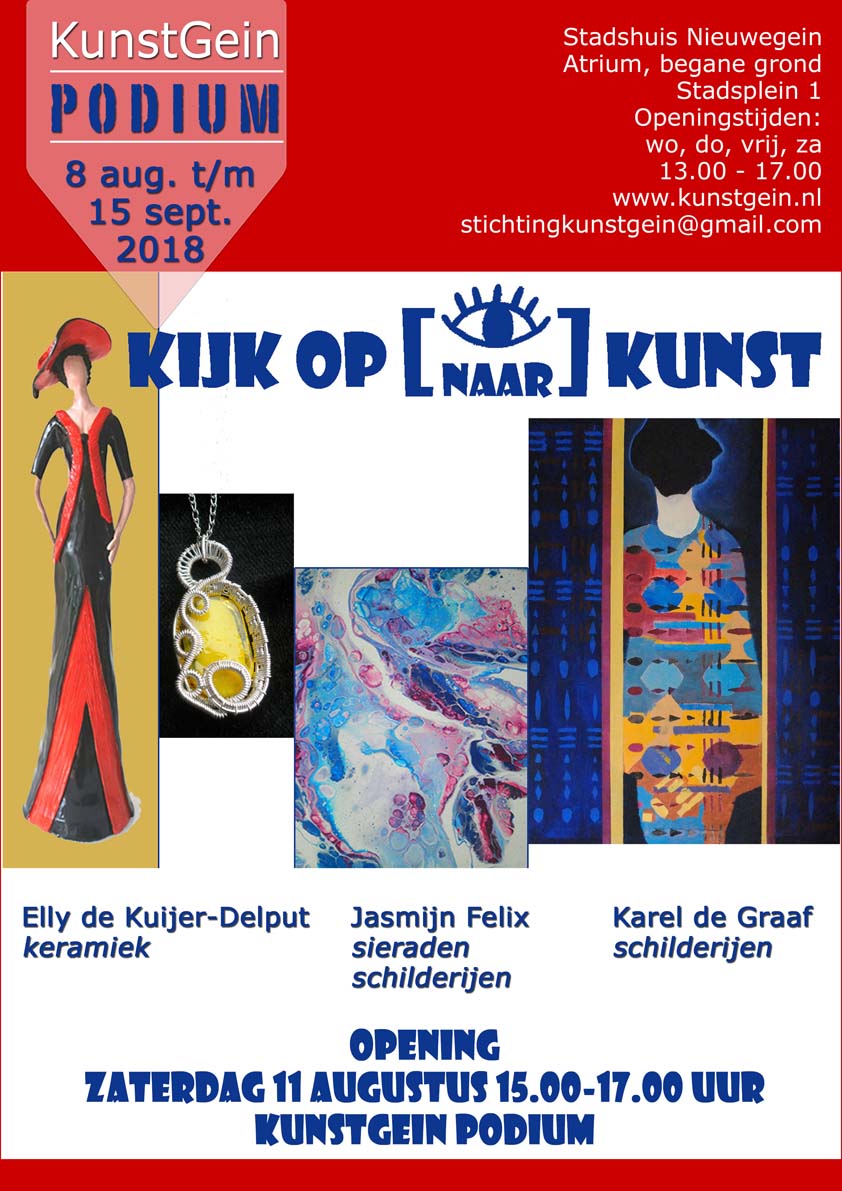 Ook tijdens de zomermaanden is er kunst te zien in KunstGein Podium. Van 8 augustus t/m 15 september tonen drie kunstenaars met verschillende disciplines hun kunstwerken. Keramist Elly de Kuijer, kunstschilder Karel de Graaf en Jasmijn Felix met sieraden en schilderijen. De feestelijke opening is zaterdag 11 augustus om 15.00, je bent van harte welkom!