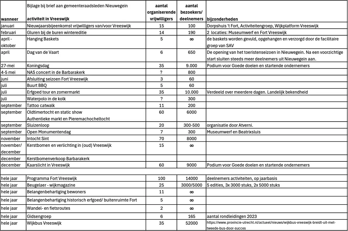 In Vreeswijk worden door vrijwilligers veel verschillende activiteiten en evenementen georganiseerd. Dit draagt bij aan de sociale cohesie in de wijk en heeft een positieve uitstraling naar heel Nieuwegein.