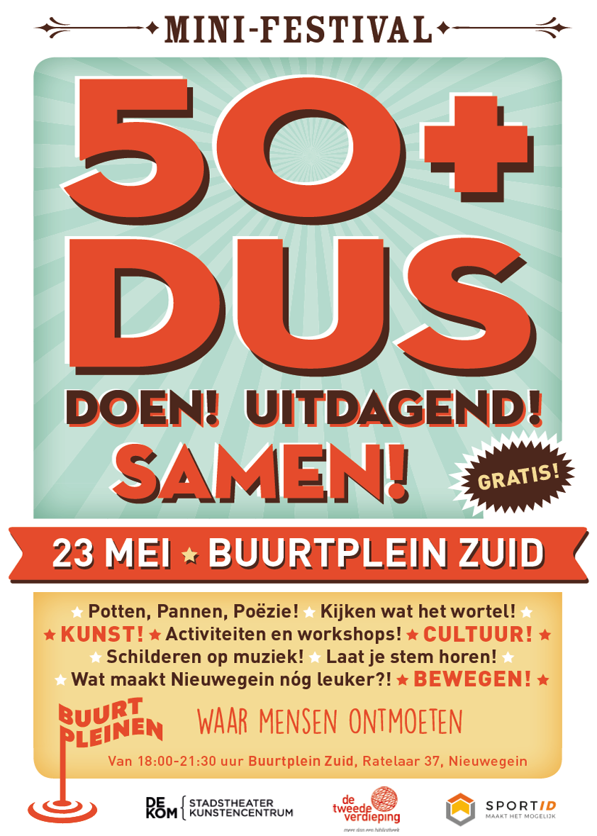 Op donderdag 23 mei van 18.00 uur tot 21.30 uur vindt het eerste 50+DUS-festival plaats op Buurtplein Zuid aan de Ratelaar 37 in Nieuwegein Zuid. Met doorlopende activiteiten zoals Potten, Pannen, Poëzie, Muzikaal schilderen, Tango je mee, Kunstzinnig koken en nog veel meer kunst-, cultuur- en beweegworkshops voor 50-plussers.