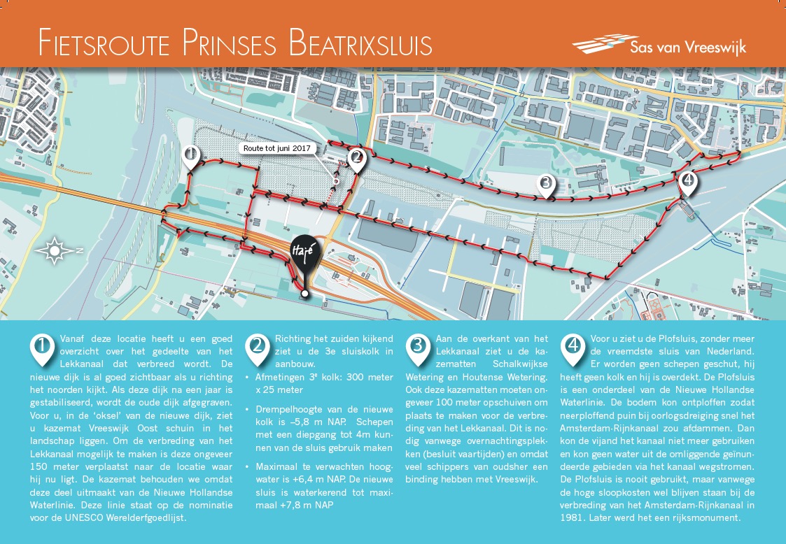 Sinds september 2016 werkt Sas van Vreeswijk in opdracht van Rijkswaterstaat aan de aanleg van de 3e kolk en de verbreding van het Lekkanaal. Het bouwterrein is groot en de veranderingen gaan snel. Juist vanaf de fiets is dat goed te volgen en op 4 locaties kunt u stoppen om het werk te beleven.