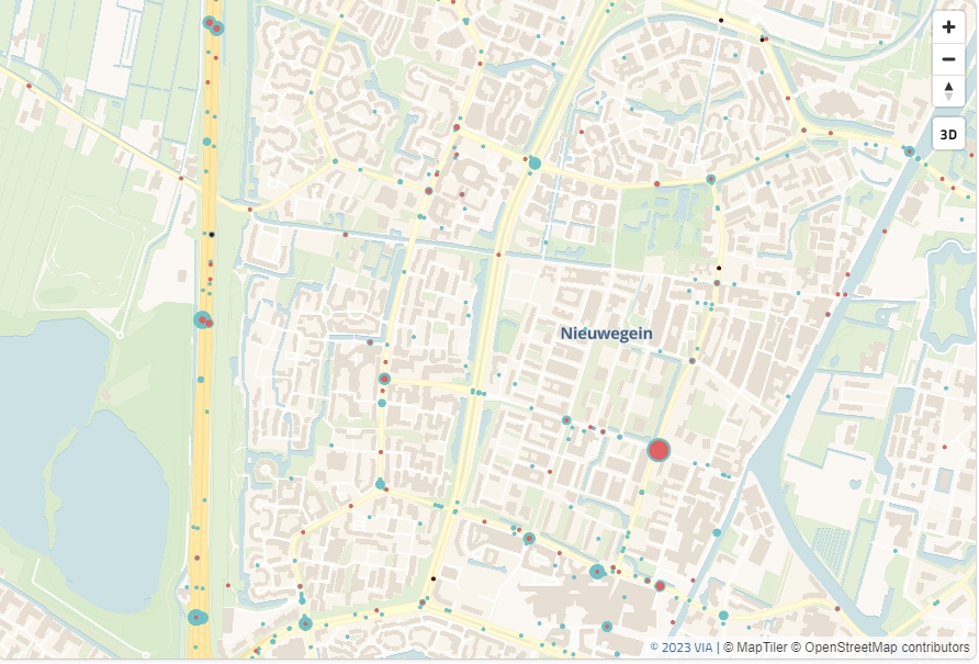 Kaart van de ongevallen in Nieuwegein tussen 2018 – 2023. Groen zijn ongevallen met uitsluitend materiële schade; rood zijn ongevallen met letsel; zwart zijn dodelijke ongevallen. De kaart is bijgewerkt tot en met juni 2022