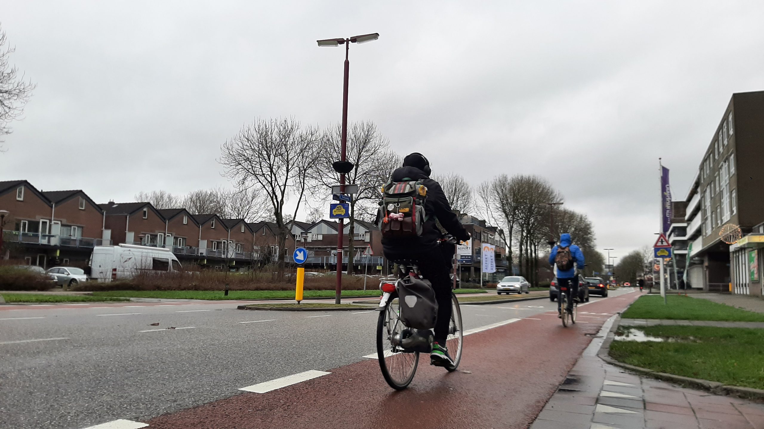 Clarion Wegerif: ‘Vandaag geen zonnige foto, want de afgelopen dagen waren vol regen en wind. Enkele fietsers spoeden zich over de Batauweg, maar we zien geen ouders met kinderen of kwetsbare ouderen. Die durven hier niet te fietsen. Op deze wijkwegen, waar fietsers de schaarse ruimte moeten delen met heel veel auto’s, ligt deze week onze focus. Lees onze reactie op de Mobiliteitsvisie Nieuwegein 2030 op nieuwegein.fietsersbond.nl‘