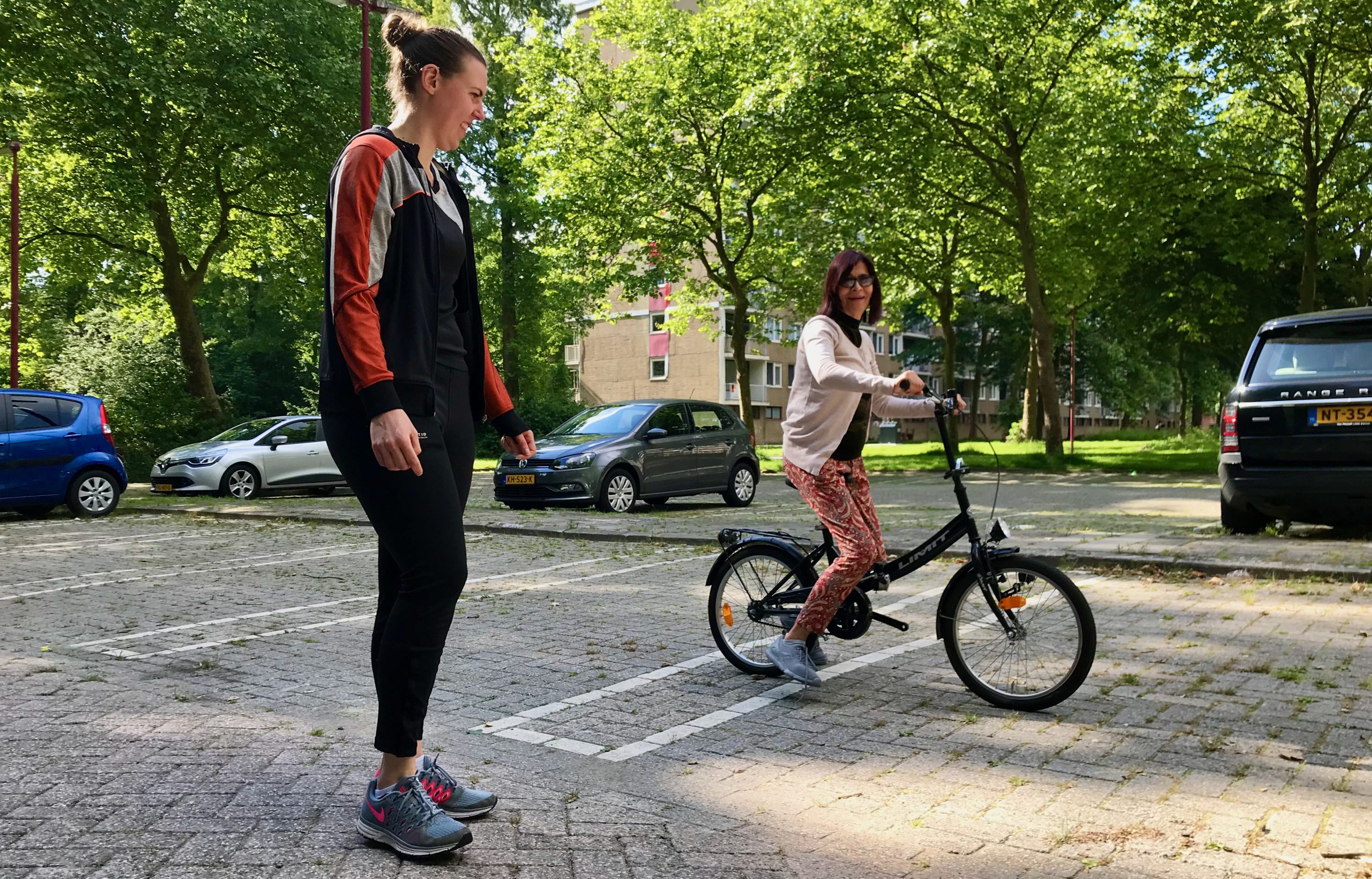 Linda: ‘Op een zonnige donderdagochtend rij ik langs het verlaten parkeerterreintje achter het Nijpelsplantsoen. Hoewel, verlaten? Twee vrouwen oefenen al ‘flappend en stappend’ om in evenwicht te blijven op een vouwfiets zonder trappers. Onder leiding van buurtsportcoach Frouke leren ze hier fietsen. De Colombiaanse Liz zit nog wat onwennig op de fiets. Haar dochter leerde eveneens hier fietsen en maakte haar moeder enthousiast. Ook leren fietsen? Meld je aan bij Frouke: f.kleijn@merwestein.nl.’