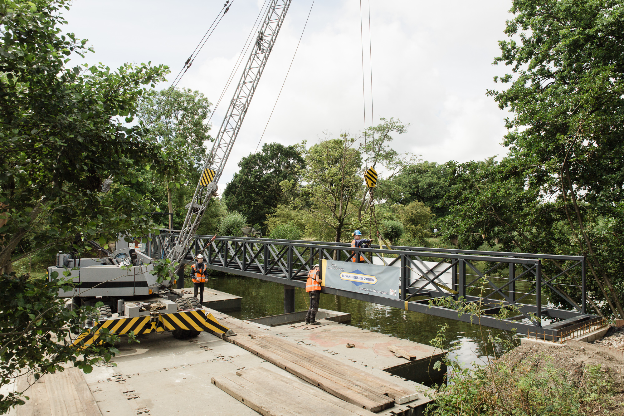 Fort Jutphaas in Park Rijnhuizen is straks goed te bereiken via een voetgangersbrug. De aannemer heeft deze week 3 brugdelen, één voor één ingehesen. De komende dagen gaan zij aan de slag met het inhangen van de poort, daarna volgt de verharding. In juli is de brug dan klaar voor gebruik. Tegelijk met de voetgangersbrug naar het Fort, wordt er ook een wandelpad aangelegd. Vanaf de brug, wandel je dan zo naar het centrale pleintje op het fort.