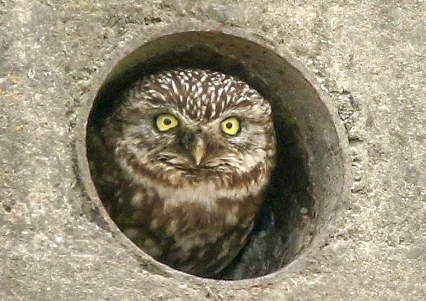 ‘Het is inmiddels zo’n 4 maanden geleden dat de kazemat aan de Lekdijk-Oost van zijn oorspronkelijke plaats is opgetild en verhuisd. Ik ben er eens gaan kijken en zag in een gat in de wand van de kazemat een steenuil zitten. Toen ik nog eens verder keek, bleek er nog een andere steenuil bovenop de bunker te zitten. Dit koppeltje steenuiltjes heeft volgens mij de best beveiligde woning van heel Nederland.’