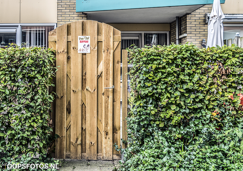 Bloemink: ‘Zomaar een straat. Zomaar een flatgebouw. Zomaar een benedenflat. Ook wel een beganegrondappartement. Mèt een tuintje, een heg, een tuindeur. En daar een bordje op: ‘Pas Op! Kippen!’. Da’s weer eens wat anders dan een waarschuwing voor een (al dan niet aanwezige) gevaarlijke hond. Zomaar in Nieuwegein.’