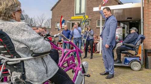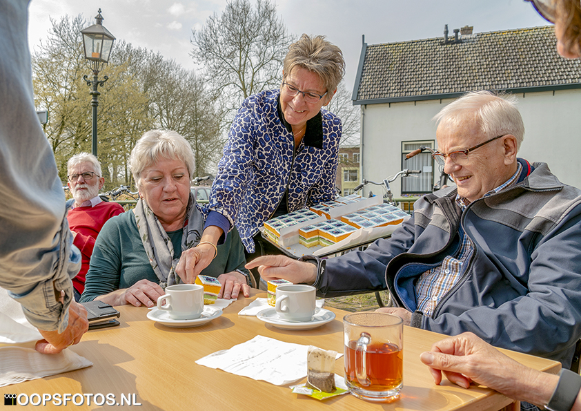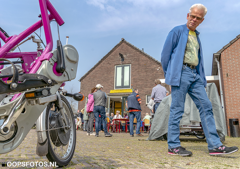 Bloemink: ‘Woensdag 11 april 2018. Fort Vreeswijk. Wethouder Hans Adriani geeft het startsein voor de officiële ingebruikname van Duofiets # 2 van de Algemene Hulpdienst Nieuwegein (foto 1). Na een rondje tussen, langs en door de verzamelde foto- en videografen werd er gefeest met koffie, thee en feestelijk gekleurd gebak. Gebak dat vakkundig werd rondgedeeld door AHN-voorzitter Monique Laurier (foto 2). En dan komt natuurlijk het moment dat de nieuwe aanwinst grondig aanschouwd moet worden (foto 3).’