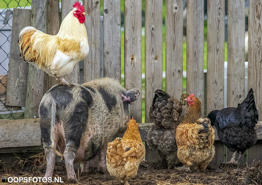 Arend Bloemink: ‘Wie wat beweegt in Nieuwegein, die ziet nog eens wat. Zo was ik onlangs op weg voor een Portret van de Week. Terugwandelend over de Galecopperdijk trof ik bij de dierenopvang dit tafereeltje aan. Het varken leek het geenszins te deren dat meneer De Haan haar rug verkoos als prima plek om zijn kippetjes in de gaten te houden.’