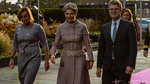 Bij de foto: ‘Koningin Máxima was vanmiddag, 29 november, aanwezig bij het jubileumcongres van CNV Vakmensen in Nieuwegein. Het congres vond plaats in het NBC Congrescentrum, waar pen-fotograaf Jordi Jupijn haar portretteerde met NBC-eigenaar Justin van Hooijdonk (rechts) en een afgevaardigde van CNV Vakmensen. Een mooie, zonnige plaat!’