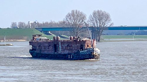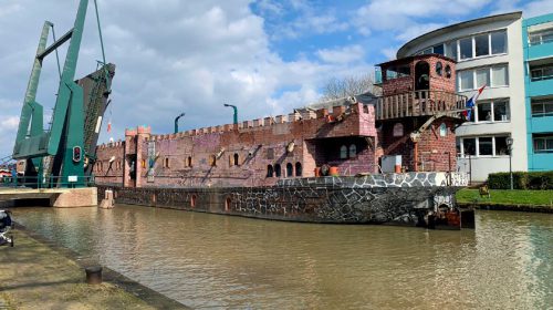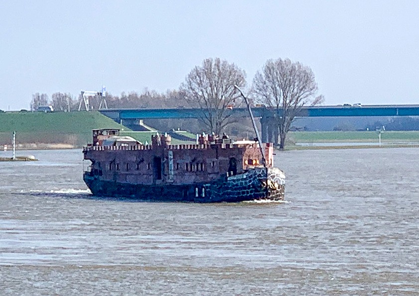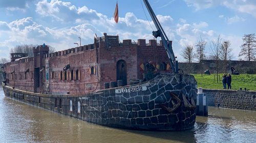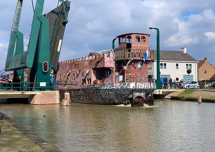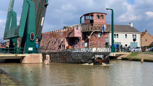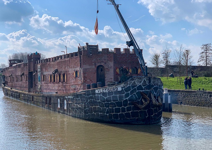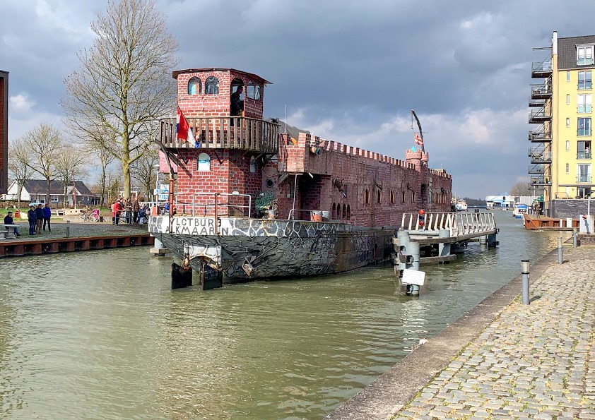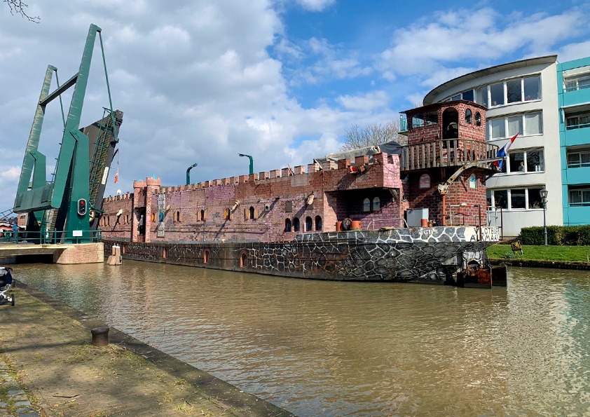 Arend Bloemink: ‘Het weer zat mee. Het weer was práchtig. En dús kon het imposante kasteelschip Vlotburg de Prinses Amaliabrug passeren, op weg naar de passantenhaven van Museumwerf Vreeswijk. Daar blijft dit wonderlijke kasteel een aantal weken liggen. Bezoekers zijn welkom! Onze website-ontwerper was ter plekke en maakte een serie foto’s. Dank je wel, Jan!’