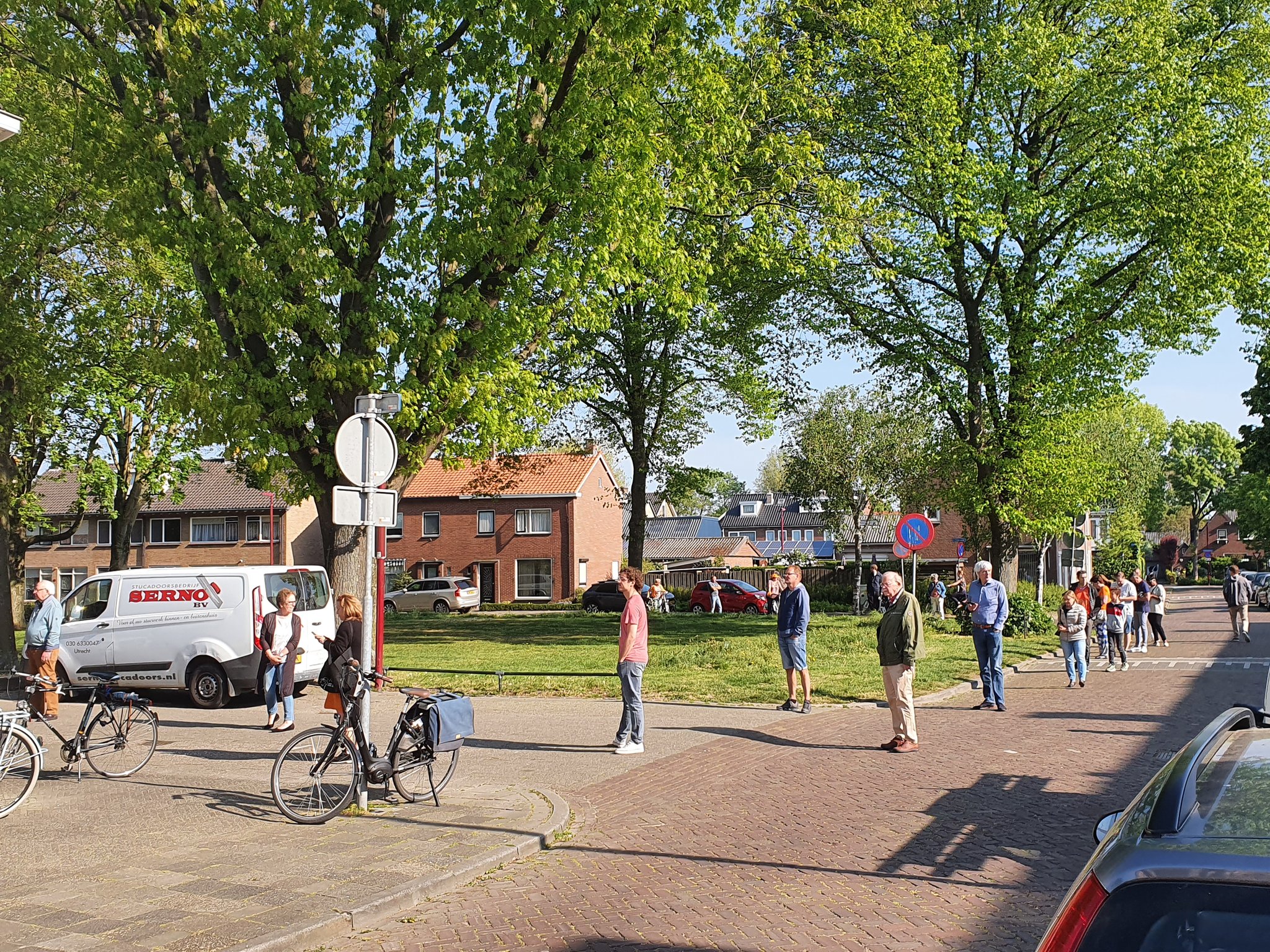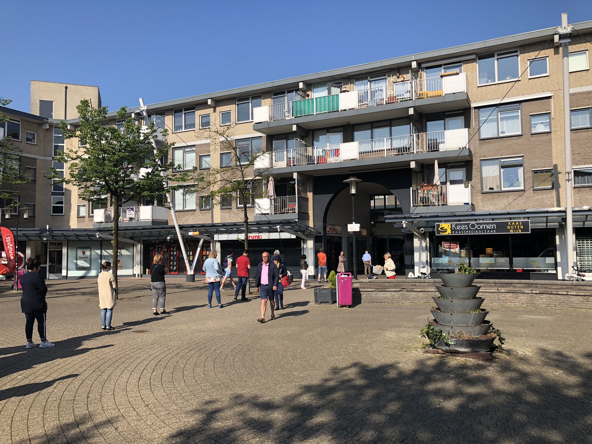 Rikz Ozinga op Twitter: ‘Een rij van 50 meter, wachtend bij de bakker op winkelcentrum Muntplein in Nieuwegein. Rij staat er al vanaf 08.00 uur vertelt een buurtbewoner: 1 klant er uit 1 er in. Goed idee, die oranje tompoezen, maar deze zullen ook wel smaken!’