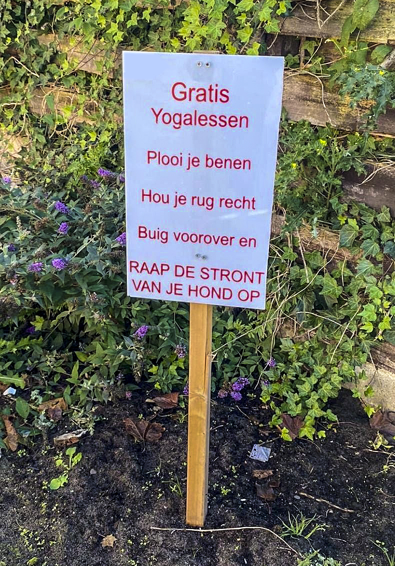 Arend: ‘Gezien in Facebook. Waarschijnlijk daar geplaatst door een vlaamstalige medemens, gezien het ‘Plooi je benen’. Zo’n aansporing zou op heel veel plaatsen in Nieuwegein ook niet misstaan. Want ondanks de opruimplicht hebben veel Nieuwegeiners daar schijt aan, hebben ze ‘afgeleid door wat dan ook’ nèt niet gezien dat de hond iets dropte of zijn ze van mening dat zo’n klein keuteltje minder vies of schadelijk is dan zo’n grote hoop.’