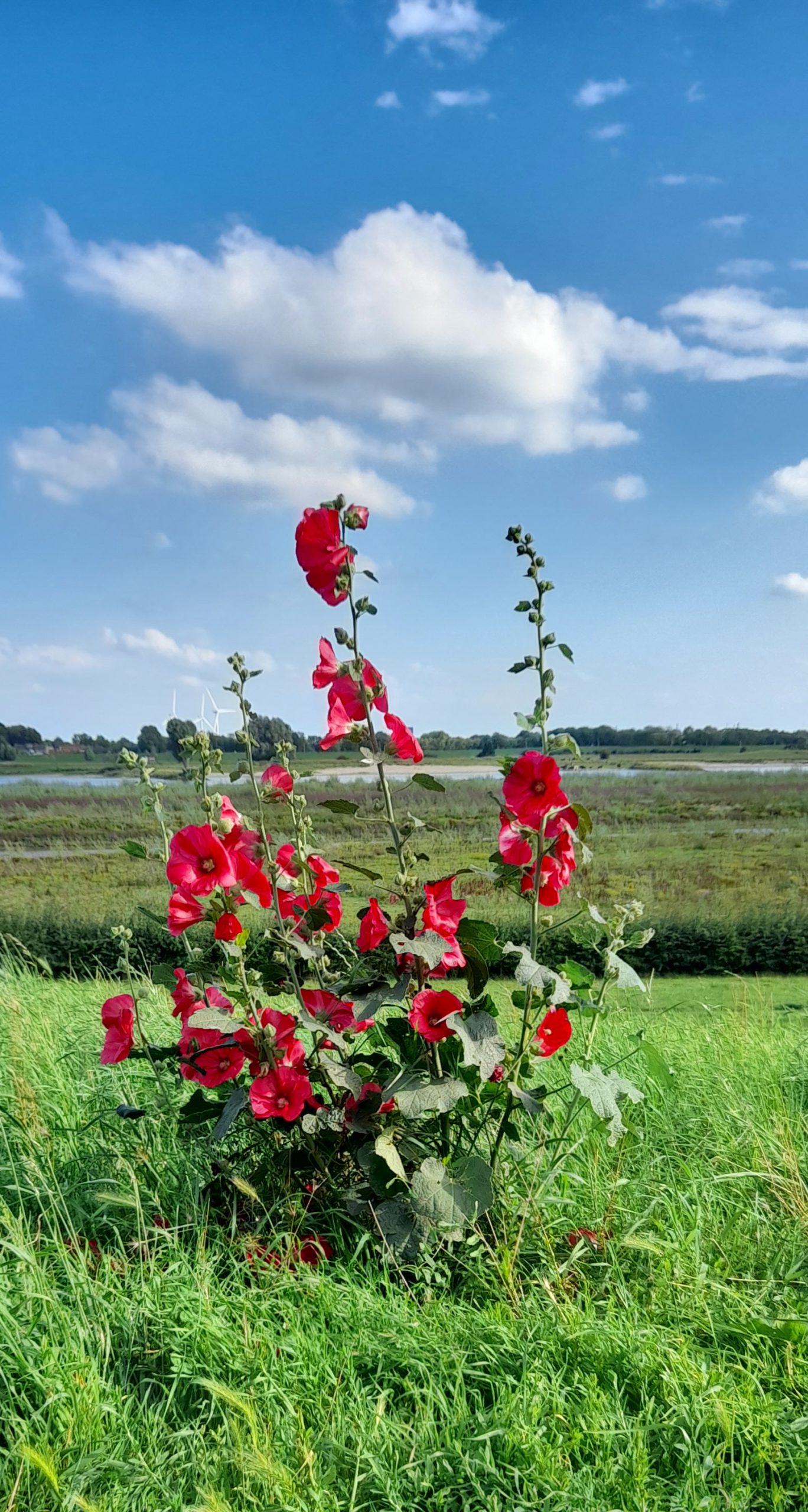 Arend schreef het volgende bij de foto: ‘Nieuwegeiner Fokko Dijkema stuurde ons vandaag zijn foto van een wilde stokroos die zich een vruchtbaar plekje aan de Lekdijk heeft verworven. De rijk bloeiende plant trekt veel kijkers. Kijkers die vrijwel allemaal aan het fotograferen slaan. Zo zie je maar: minder maaien móet!
