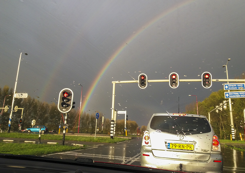 En toen was het zondag. Zondag 5 november. En toe ging het regenen. Heel hard. En tegelijkertijd scheen de zon. En wanneer je dan voor het stoplicht staat te wachten, dan pak je snel je telefoon en KLIK, je hebt de regenboog te pakken. Op de A.C. Verhoefweg. Bij de Taludweg.