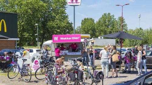 Bloemink: ‘Vanmiddag deelde ‘Wakker Dier’ pal naast de McDonalds in Blokhoeve gratis ‘Happy Chicken Deals’ uit, een variant op McDonald’s Happy Chicken Meal. Belangstellenden, gehoopt was op héél veel kinderen, konden gratis een doosje Happy Chicken Deal, gevuld met ‘kipnuggets, patat en een sausje, krijgen. En omdat vooraf aangekondigd was dat de directie van McDonalds met de Wakkere Dieren in gesprek zou gaan, was er (naast pen.nl) nogal wat pers aanwezig. Helaas, en een beetje kinderachtig, kwam van dat gesprek niets terecht. McDonalds verscheen niet ter plekke. De pers kon zich vervoegen ín McDonalds. Jammer dan…’