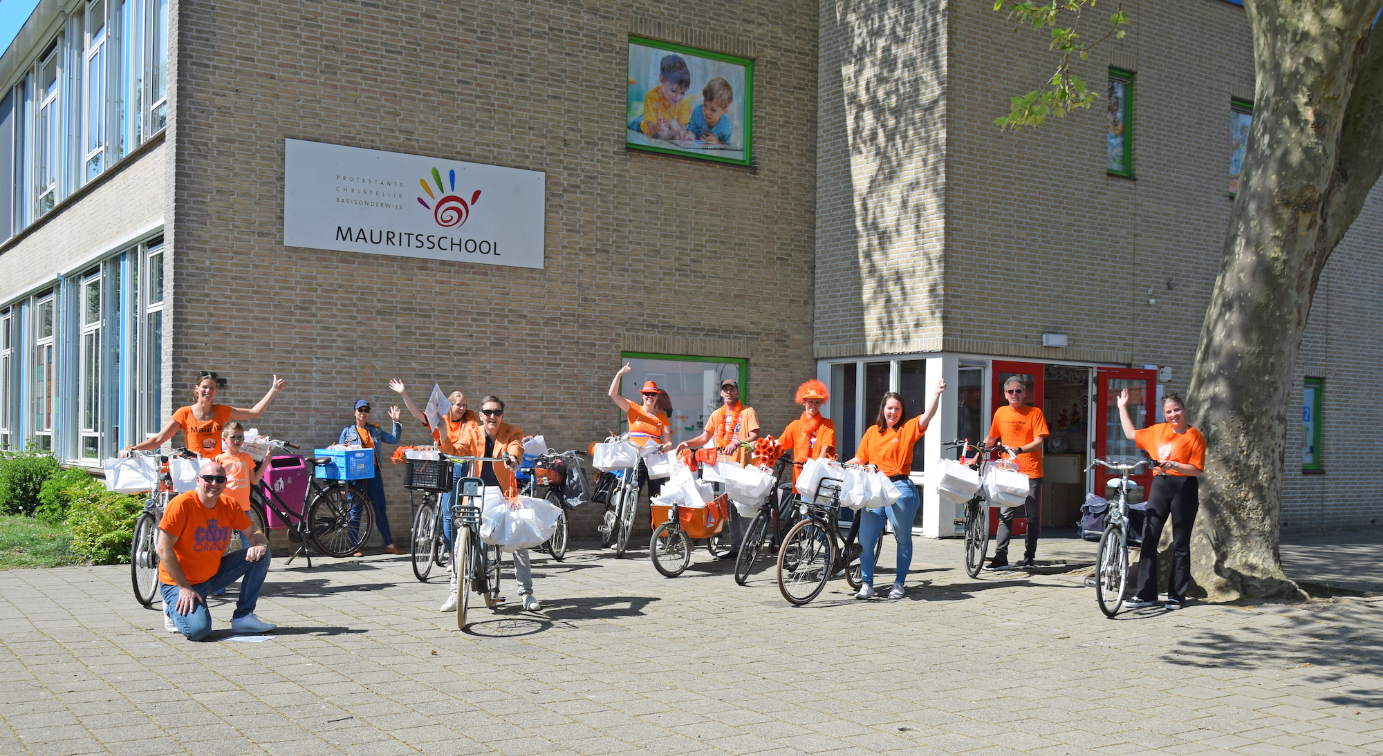 De leerkrachten van de Mauritsschool in Nieuwegein gingen vandaag op pad om alle leerlingen een Koningsspelen thuispakket te bezorgen. In het pakket zit o.a. een oranje pingpongballetje, oranje ballonnen, een koek om te koekhappen en een stempelkaart om lekker thuis aan de slag te gaan, maar ook een leuk boekje “Hoe overleef ik de meivakantie”.
