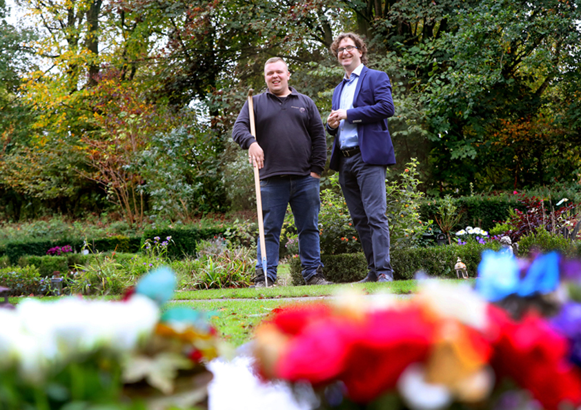 Wethouder Martijn Stekelenburg en Rick Lamme op de begraafplaats.