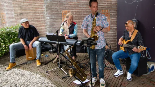 De opening van het festijn door Poirot Rode Arie en wethouder Marieke Schouten, die zich niet door hem op de kop liet zitten en de uitdaging om een bordje op te gooien meteen aan nam. Daarna was het tijd om te genieten van de muziek van Britta Maria, afgewisseld met troubadour Hans Pekelharing. Bovendien liepen er de hele middag twee accordeonisten (ook allebei Hans genaamd) over het terrein ter vermaak.