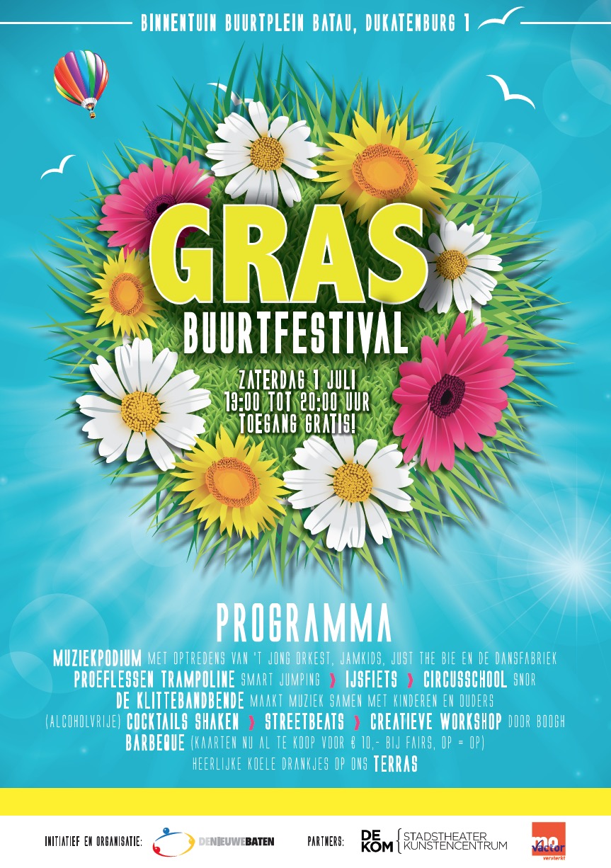 De Baten is niet alleen een fantastische plek om te wonen in de mooie wijk Batau Noord, maar slaat ook een verbinding tussen bewoners, maatschappelijke organisaties en cultuur. Op zaterdag 1 juli 2017 komt dit tot uitdrukking in het Grasfestival! Samen met haar partners Stadstheater en Kunstencentrum De Kom en Movactor, organiseert Stichting De Baten een festival in haar binnentuin aan de Dukatenburg.