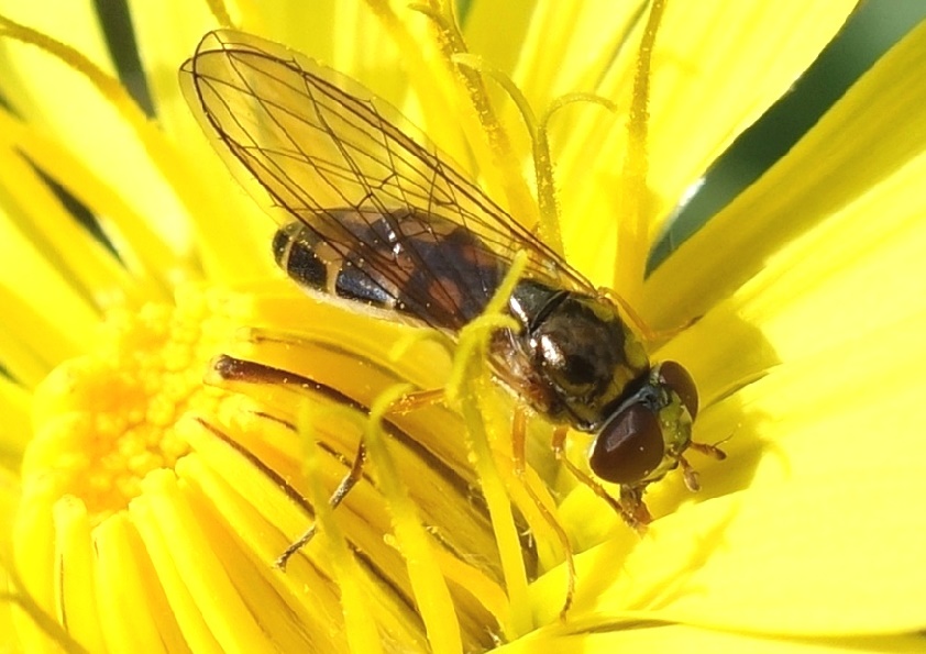 Udo: ‘Paardenbloemen overal, en overal wilde bijtjes en hier en daar een vlieg. Gisteren zag ik de heel algemene slanke driehoekszweefvlieg, nog geen cm lang en allesbehalve slank, voor een vlieg. Bij deze.’