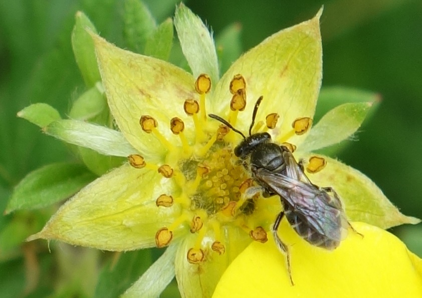 Udo: ‘De bijen zijn vlijtige insecten, dat weet iedereen. En er zijn heel veel soorten, dat ziet niet iedereen. Het SLANKE GROEFBIJTJE is er daar één van. Dit dametje is echter wel zwart, maar niet slank. De naam heeft zij aan de mannelijke slanke groefbijen te danken, die steken maar magertjes af bij haar bolle vormen.’