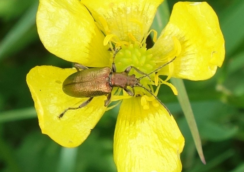 Udo: ‘Langs Nieuwegeinse waterkanten zijn in mei en wat later meestal wel rietkevers te ontdekken. Ze zijn niet erg schuw, maar wel mooi gekleurd dus dat ontgaat je niet. Deze “trage” rietkever viel op door zijn kleur, zo ongeveer 14-karaats goud. Helemaal bling bling…’