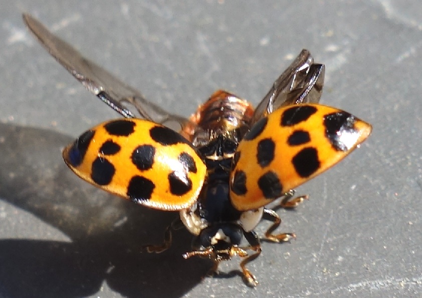 Udo: ‘Lieveheersbeestjes zijn duidelijk te veel etende, bolle kevertjes die bladluizen als tussendoortjes eten en ondanks hun geringe afmetingen op vallen door hun kleur. Met hun schildjes opgeheven kunnen ze vliegen, of je zou het vliegeren kunnen noemen. Zoals dit veelkleurig Aziatisch lieveheersbeestje, dat net een geslaagde landing heeft gemaakt.’