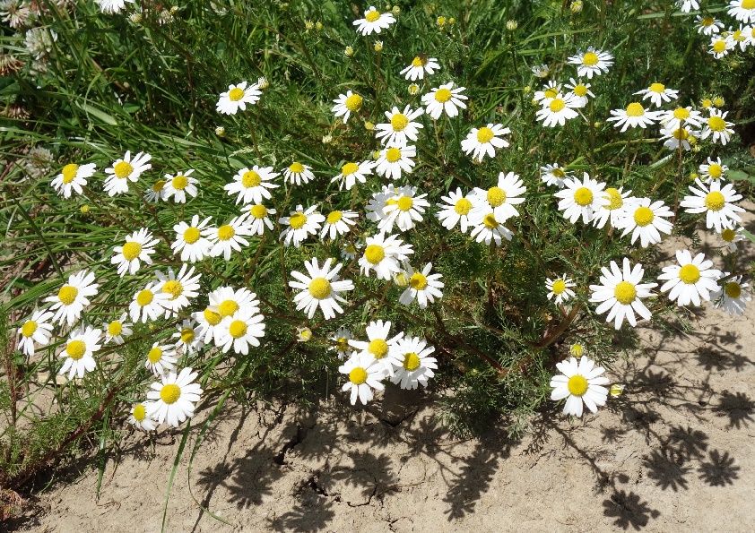 Udo: ‘Gelooft u ook heilig in de heilzame werking van allerlei kruiden? Nou, daar valt wel wat op af te dingen… Maar er zijn ook kruidjes waar je geen nee tegen zegt. Als het niet om de werking is, dan is het wel om de prachtige bloemen en/of de geur daarvan. Echte kamille is er daar één van. Een plant die breder is dan hoog (tot 40 cm). En altijd in de volle zon. Valse kamille is groter en nòg mooier, maar die ruikt niet zo lekker. Eigenlijk helemaal niet. Wordt ook nog getoond. Later.‘
