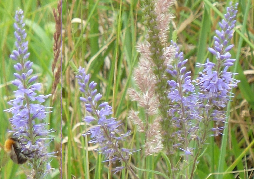 Udo: ‘In nieuwegein zijn vele soorten ereprijs te vinden. Grote, kleine en ook lange ereprijs, bijvoorbeeld. De lange is er in 2 variaties: lila kleurig, de wilde soort en hemels blauw, de tuinsoort. De lila lange ereprijs werd op een terrein in de Liesbosch gevonden en piekte net boven het hoge gras uit. De rossige graspluim er tussen is van de gestreepte witbol, die dus ook rossig kan zijn en het hommeltje is waarschijnlijk een boomhommel.‘