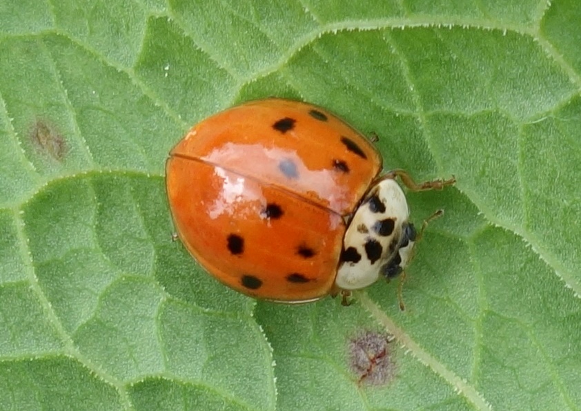 Udo: ‘De Nieuwegeinse tienstippelige lievenheersbeestjes hebben eigenlijk 14 stippen, 10 op de schildjes en vier op het borststuk. Die vier gelden dus niet. Je raakt zo gemakkelijk de tel kwijt, en het kan nog erger: het veelkleurig Aziatisch lieveheersbeestje (ook in Nieuwegein) varieert in kleur én in aantal stippen. Lieve hemel! Enfin, dit is dus het, eh…, tienstippelig lieveheersbeestje.‘