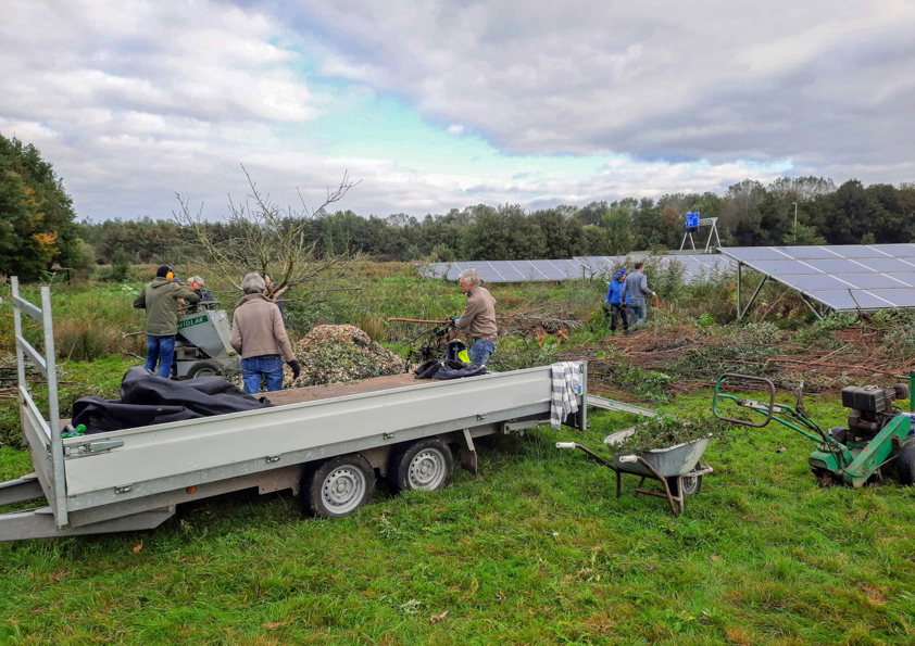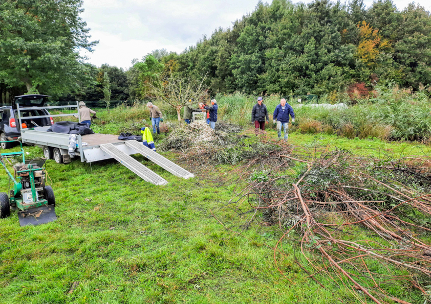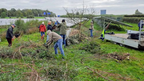 Prima weer, goede koffie en broodjes en bijna 20 harde werkers waren zaterdagmorgen vroeg in de weer om de struiken weer tot normale hoogte terug te snoeien en een heel wilgenbos te kortwieken…
