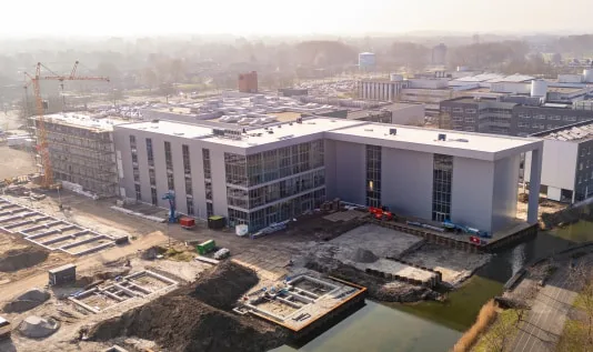 Het National Climbing Center van buitenaf zoals het er nu bij ligt