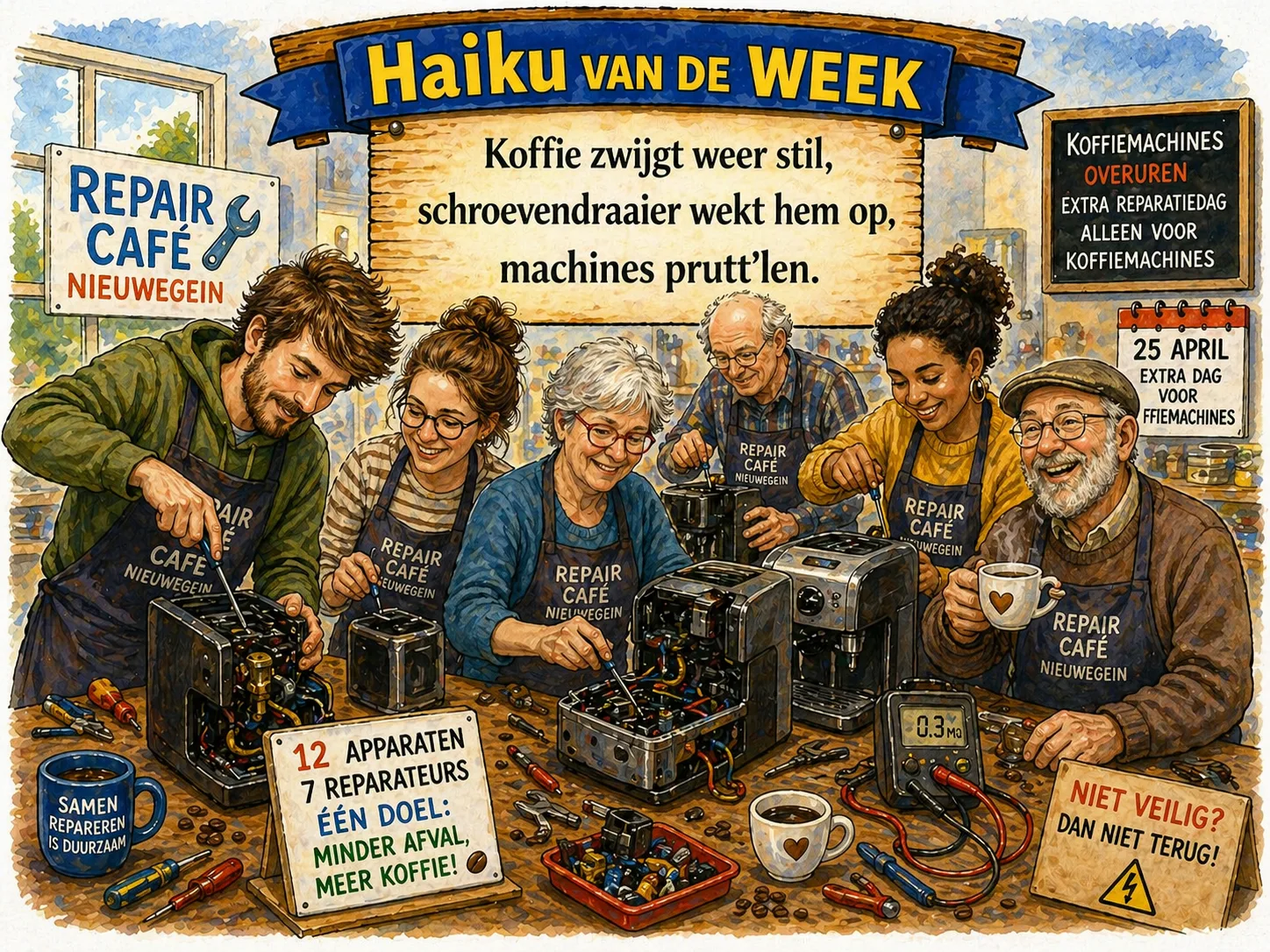 Deze week gaat de haiku over de extra reparatiedag die het Repair Café in Nieuwegein heeft ingelast. Alleen voor koffiemachines. De wachtlijst voor defecte koffiemachines is met deze actie nog niet helemaal verdwenen. Mogelijk herhaalt Repair Café Nieuwegein de inhaalslag later dit jaar nog eens. Lees maar.