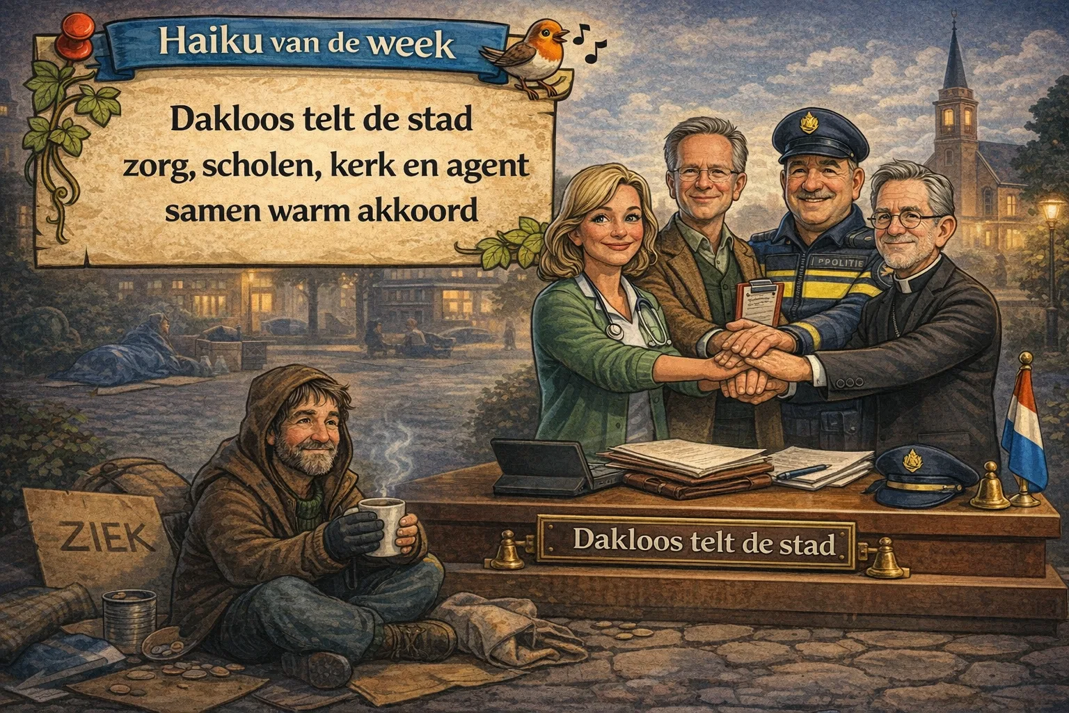 Deze week gaat de haiku over dat Nieuwegein op dinsdag 12 mei 2026 meedoet aan de ETHOS-telling, een landelijke telronde die dak, en thuisloosheid breder in beeld moet brengen dan we gewend zijn. Wethouder Guido Bamberg roept organisaties in de stad op om mee te tellen, juist omdat een groot deel van de problematiek buiten beeld blijft. Niet iedereen die geen vaste plek heeft, staat namelijk bij een loket, of slaapt in de nachtopvang.