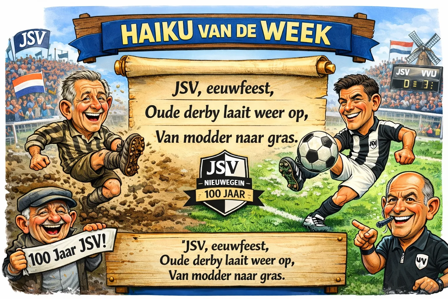 Deze week gaat de haiku over dat voetbalvereniging JSV 100 jaar bestaat. Het jubileum wordt op zondag 26 april aanstaande gevierd met een uitgebreid programma, met als blikvanger een reünie voor oud-leden en een jubileumwedstrijd tegen VVIJ, een affiche dat bij oudere voetballiefhebbers direct herinneringen oproept en Galecop weer in vuur en vlam zal zetten.
