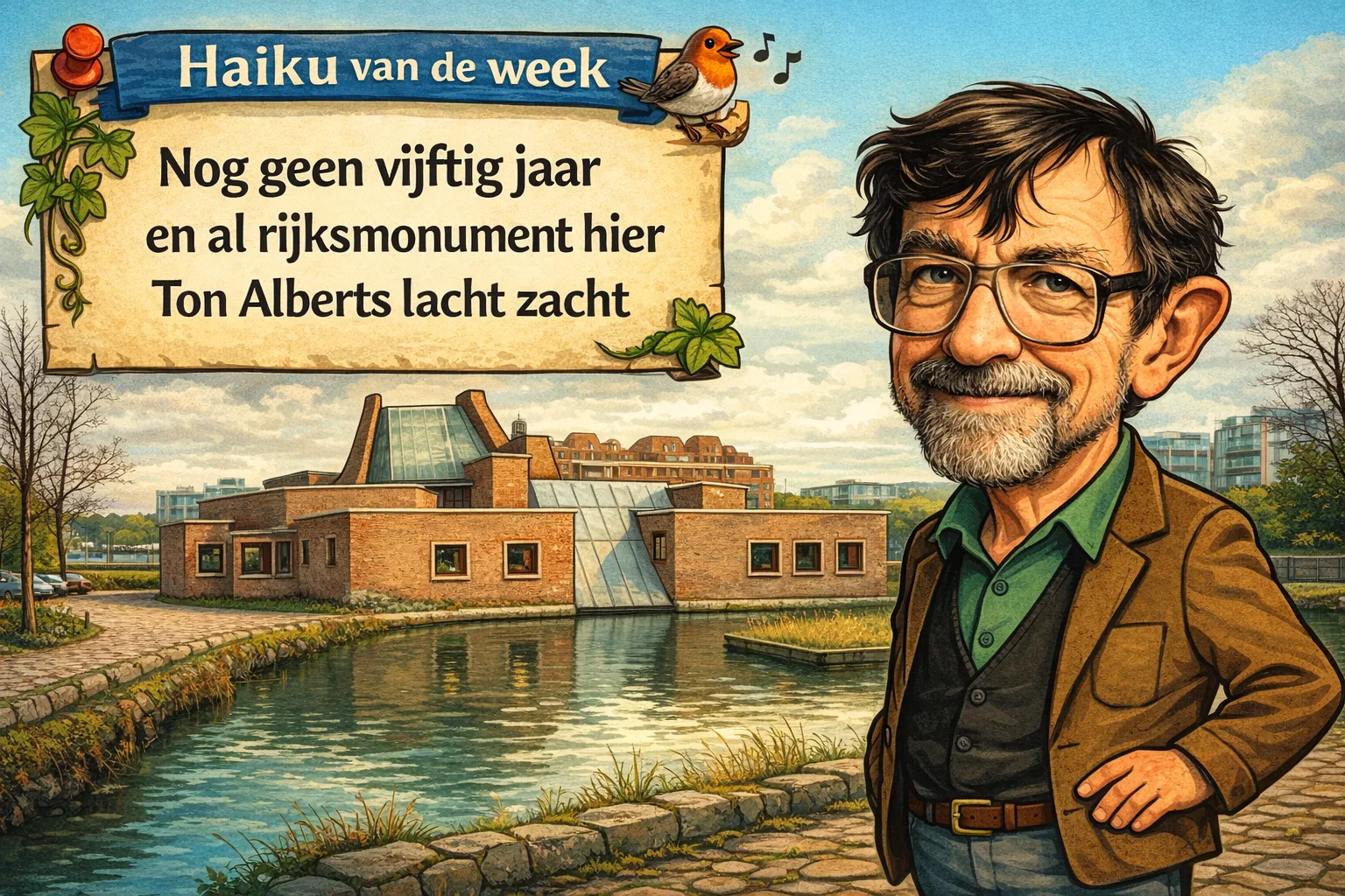 Deze week gaat de haiku over de lezing die Grieta Felix gaat geven over de Emmauskerk in Nieuwegein. De Emmauskerk is gebouwd in 1976 en 1977 en ontworpen door Ton Alberts, met medewerking van beeldend kunstenaar Arnold Hamelberg. Het is geen klassieke kerk met rechte lijnen en een lange middenbeuk, maar een gebouw dat juist inzet op ontmoeting en een andere liturgie, passend bij de na 1965 veranderende kijk op kerk en samenleving. En nu al een Rijksmonument. Dat is een haiku waard!