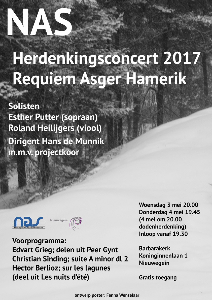 Dit jaar is gekozen voor het Requiem van Asgar Hamerik (1809-1877) voor koor en orkest. Voor Nederland betreft het een première! Deze Deense componist en dirigent (een vriend van Hans Christian Andersen) genoot in zijn tijd veel bekendheid in Berlijn, Wenen en Parijs maar hij is daarna in de vergetelheid geraakt. Echter, op dit moment is er sprake van herwaardering en door het Nas zijn kosten nog moeite gespaard om zijn bladmuziek boven tafel te krijgen. Op het voorprogramma staan o.a. delen uit Peer Gynt van Edvart Grieg; Suite A deel 2 minor van Christian Sinding en sur les lagunes van Berlioz. Al met al belooft het een prachtig en uniek concert te worden. Traditiegetrouw wordt een grote opkomst verwacht. Naar we verwachten biedt de kerk voldoende zitplaatsen. Desalniettemin raden we u aan op tijd te komen.