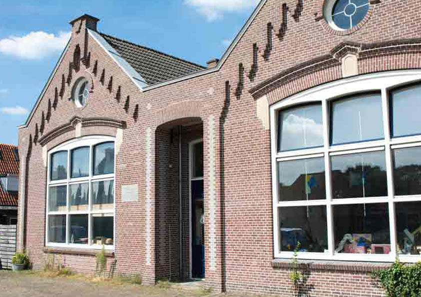 De voorzijde van de gerestaureerde school.