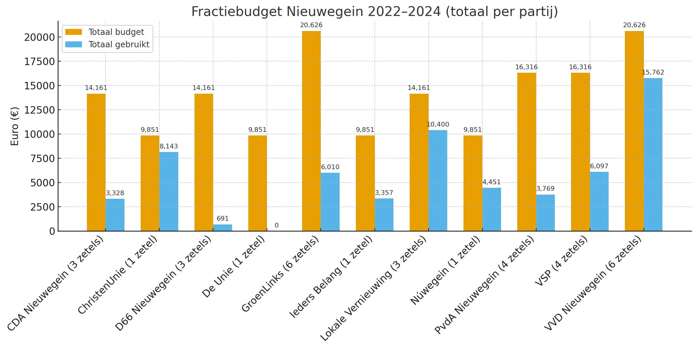 Grafiek: totaal gekregen budget versus totaal uitgegeven per fractie (2022–2024). Zo zie je in euro’s hoe groot de verschillen echt zijn – van ChristenUnie die bijna alles benut, tot De Unie die drie jaar lang geen cent uitgeeft.