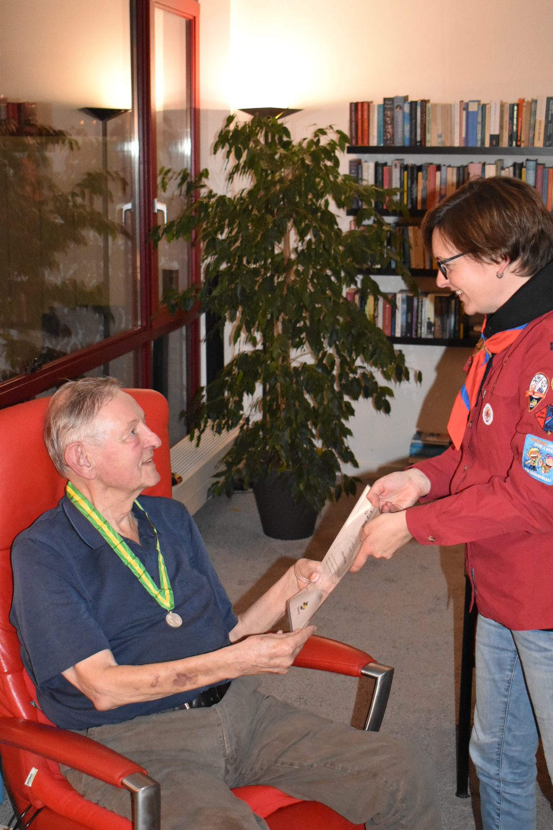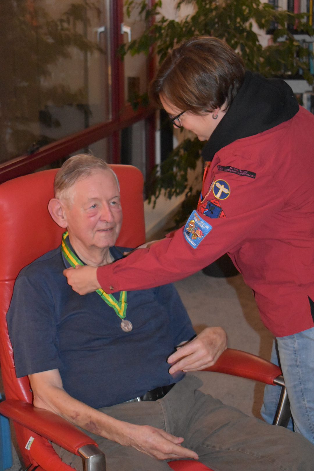 Vrijdag 12 december kl. heeft vrijwilliger Hans van Oosten uit handen van Fedde Boersma, directeur van Scouting Nederland, de hoogste onderscheiding van Scouting uitgereikt gekregen. Het gaat om een Zilveren Wolf. Van Oosten, die uit Nieuwegein komt, heeft er mede voor gezorgd dat het onderwerp ‘sociale veiligheid’ op de agenda staat van de landelijke vereniging én bij groepen en regio’s. Zijn inzet draagt eraan bij dat Scouting een veilige omgeving biedt aan kinderen en jongeren, zodat zij zich in een uitdagende omgeving kunnen ontwikkelen door het spelen van het Scoutingspel. Het is de tweede keer dat dit waarderingsteken is uitgereikt.