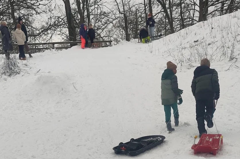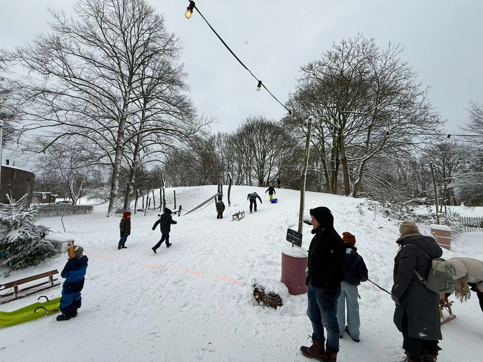 Even verderop veranderde het terrein in een klein sleeparadijs. Ouders en kinderen hadden van alles meegenomen: houten sleeën, plastic glijplanken, en zelfs een exemplaar met stuur. In de sneeuw ontstonden twee nette hellingen waar de hele ochtend enthousiast vanaf werd gegleden. Voor de vorm werd een finishlijn in de sneeuw gespoten, maar het wedstrijdelement bleek overbodig. Hier ging het niet om winnen, maar om nóg een keer.