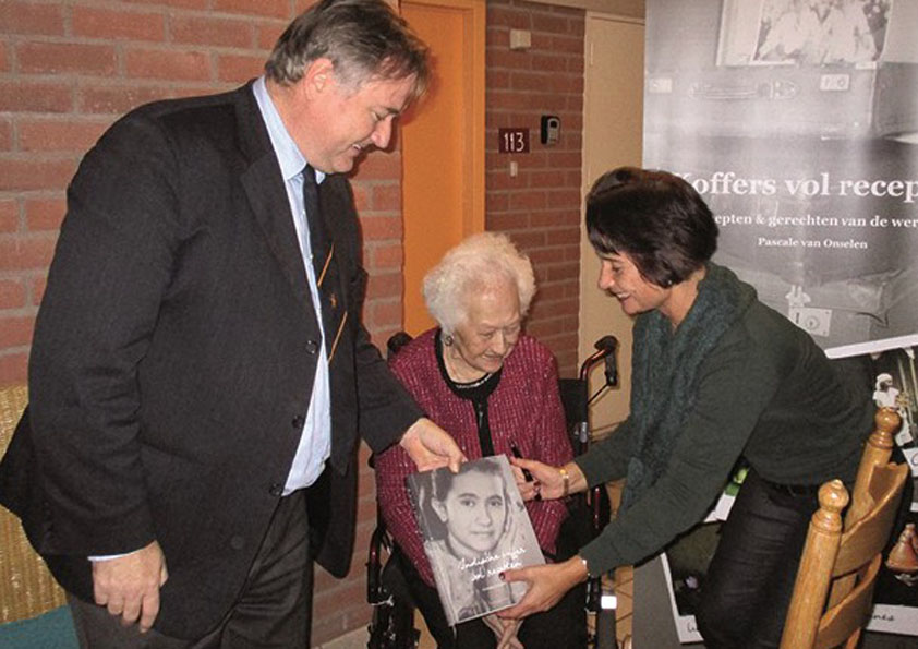 Wethouder Johan Gadella nam vrijdag 24 november het familiekookboek ‘Indische koffer vol recepten’ van schrijfster Pascale van Onselen in ontvangst. In het boek staan 60 recepten, afgewisseld met verhalen over de familiegeschiedenis, van haar oma Stien Boermeester (94 jaar). Oma Stien woont nog zelfstandig in haar aanleunwoning bij verzorgingshuis Vreeswijk in Nieuwegein. De overhandiging vond plaats in haar woning.