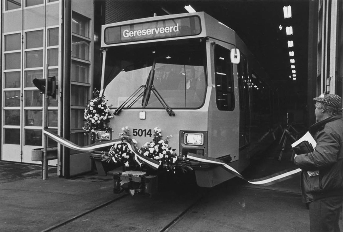 Foto: Op zaterdag 17 december 1983 werd door de toenmalige Minister van Verkeer en Waterstaat, mw. Nelie Smit-Kroes, de tramlijn Utrecht-Nieuwegein geopende door de eerste tram met het nummer 5014 de remise uit te rijden.