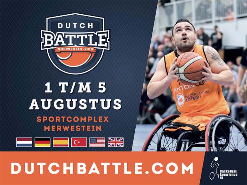 Van 1-5 augustus strijden 7 internationale rolstoelbasketbalteams in Nieuwegein om de Dutch Battle trofee. Deelnemers zijn Turkije, Duitsland, Spanje en Nederland bij de mannen. Het vrouwentoernooi bestaat uit Amerika, Groot-Brittannië en Nederland. Een toernooi in voorbereiding op het wereldkampioenschap dat eind augustus plaats zal vinden in Hamburg, Duitsland. Altijd al eens rolstoelbasketbal willen ervaren? Koop een kaartje aan de deur (3,- euro voor een dagticket, 6,- euro voor een toernooi-ticket) of maak gebruik van de zwemaanbieding!