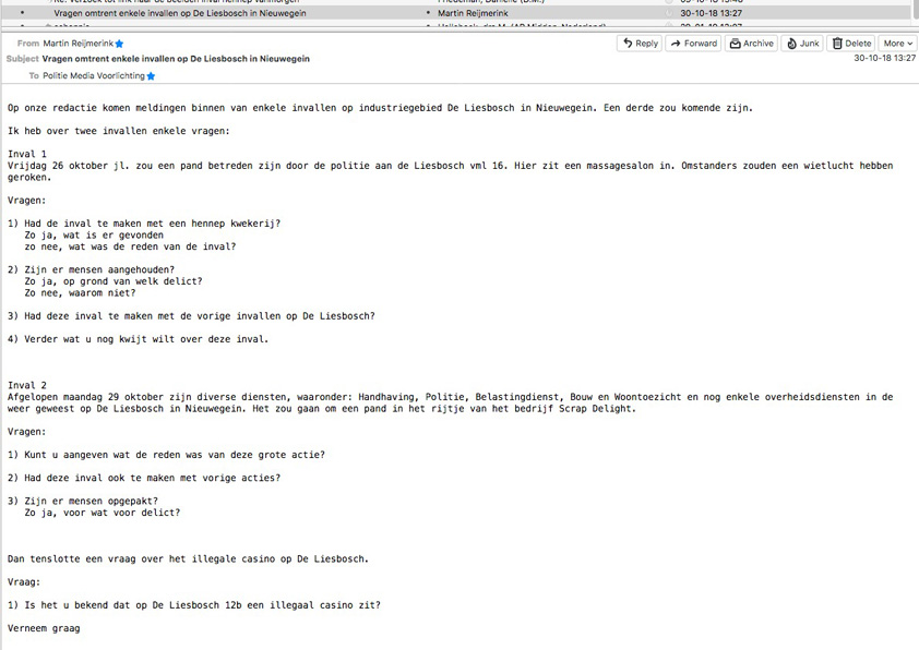 De gestelde vraag aan Politie Media Voorlichting op 30 oktober 2018 over het casino waarop de politie verzocht niets te melden ivm onderzoek.