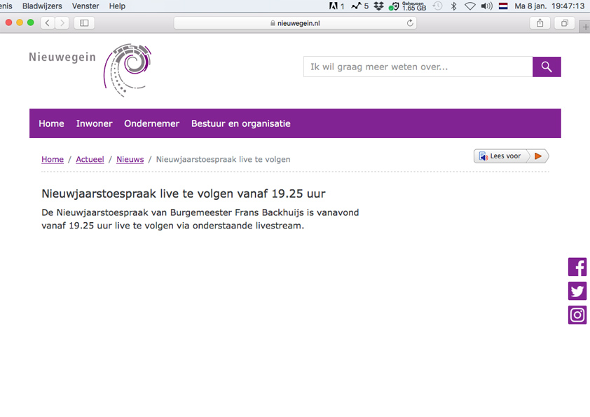 Maandagavond werd in DE KOM zoals gebruikelijk de nieuwjaarsreceptie gehouden van de gemeente Nieuwegein. Ik besloot niet naar het voorprogramma te gaan want de gemeente Nieuwegein had al een week lang aangekondigd dat deze live zou worden uitgezonden vanaf de voorpagina van haar website. Kon ik dat lekker rustig thuis bekijken om daarna op mijn fietsje richting de receptie te gaan, ik woon toch vlakbij. Een mooie belofte van de gemeente Nieuwegein om het nieuwe jaar mee te beginnen, die live uitzending. Een jaar waar overigens nog veel meer beloftes zullen worden gemaakt, immers zijn dit jaar op 21 maart weer de gemeenteraadsverkiezingen.